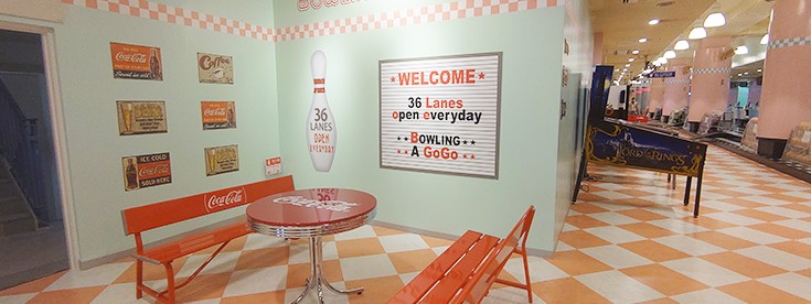 ボウリング王国スポルト横須賀店はアクセス抜群!! 京急汐入駅より徒歩5分、JR横須賀駅より徒歩8分にある商業施設のコースカベイサイドストアーズ内6階で、年中無休で営業中。レーン数は広々36レーン・内装は、アメリカンオールディーズを体感できるレトロでポップなボウリング場です。会社の歓送迎会や打ち上げなどに是非ともご利用ください。最大180名様までご予約可能です!!また、小さなお子様でも楽しくボウリングができる、ガダー無しレーン「ボールウォール」を全レーンに設置。投球補助代や貸し靴も14㎝からご用意しております。25レーン~36レーンは、自動で上げ下げとなるボールウォールもあり、ご家族で盛り上がって楽しんで頂けます。本格的にスポーツボウリングを楽しみたい方に必見。充実したプロショップがあり、経験豊富なプロボウラーがドリルをさせて頂きます。